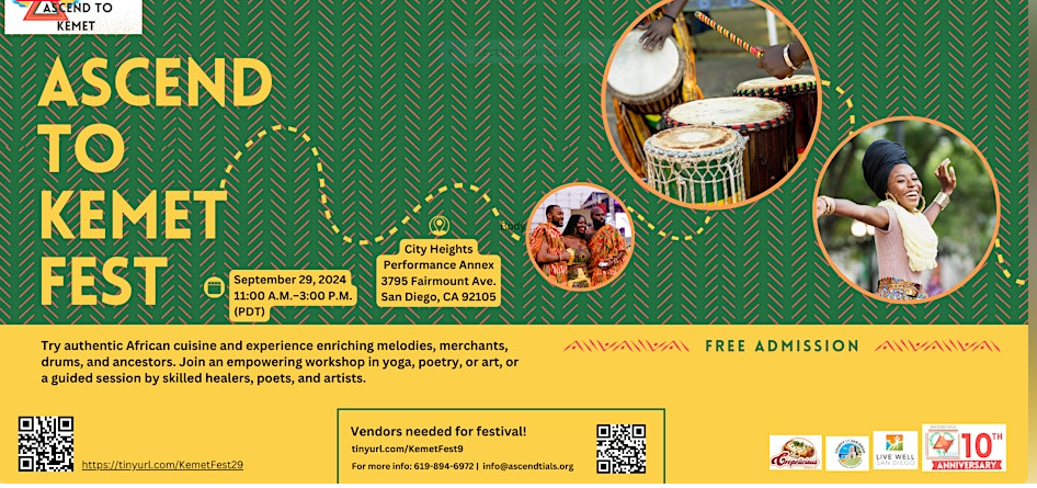 Immerse yourself in a diverse array of captivating workshops at our ASCEND to Kemet Fest, where we will delve into Kemetic Yoga, poetry, and artistic expression. The workshops will range from 20 to 40 minutes and center on holistic thinking, familial values, and knowledge of self–the core tenets of this vibrant culture. Beyond creative endeavors, the ASCEND to Kemet Fest strongly emphasizes environmental consciousness through the lens of our ancestors, underscoring the significance of climate, nature, and overall well-being. Additionally, we will feature foods from the Diaspora from East and West Africa, dance, drums, and an array of artisan vendors and performers. All registration/ticketing fees will be used to pay for the fees of the fest and create job assistance, internships for the youth, and a safer, communicative environment, with fun for all families, with fresh foods, and low-cost entertainment.
